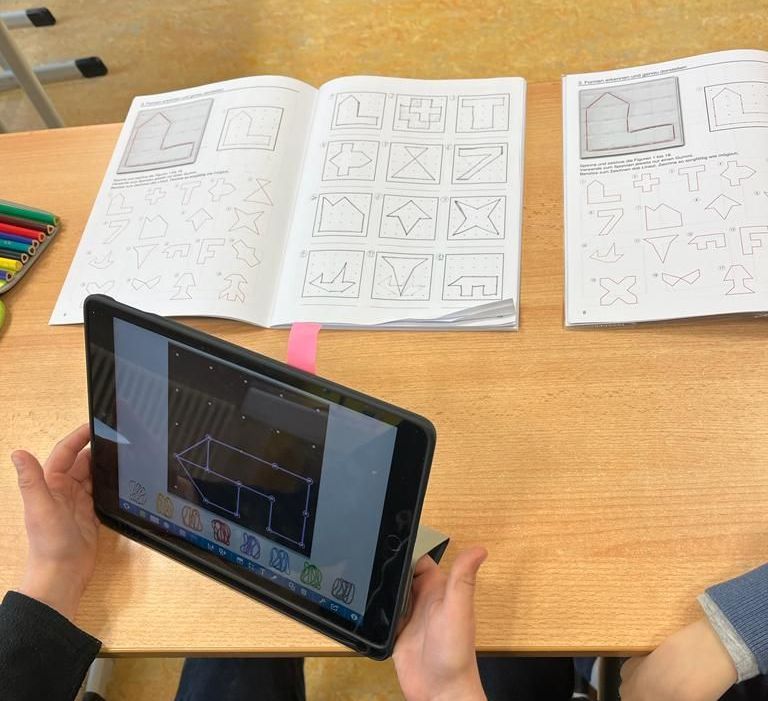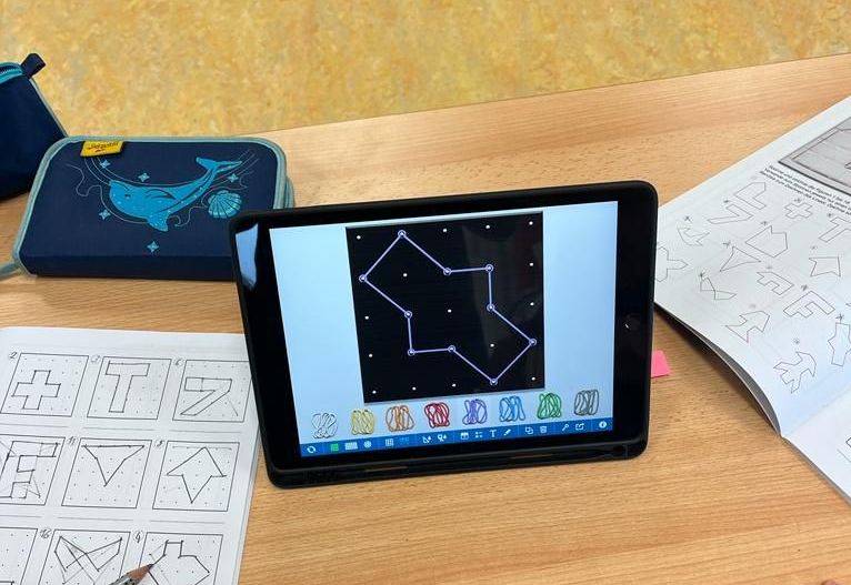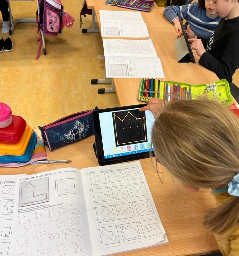 Um die mathematischen Kompetenzen zu stärken arbeiten unsere Schülerinnen und Schüler vor allem mit handlungsorientierten Materialien. Das Geobrett ist mit dem Spannen von Figuren ein gerne genutztes Mittel im Mathematikunterricht. Aber natürlich darf auch die Medienkompetenz nicht zu kurz kommen. Und deshalb wird nicht nur gespannt und gezeichnet sondern auch digital nachbearbeitet, Flächen eingefärbt und neue Formen erkundet.