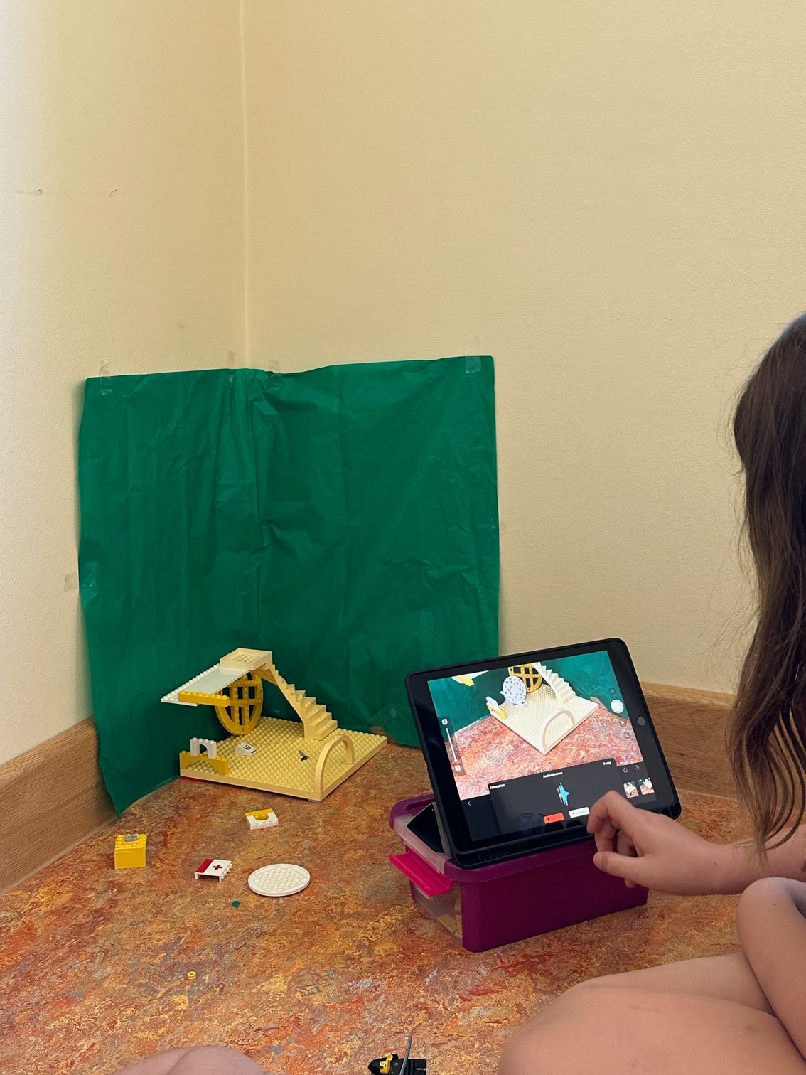 Als erstes bildeten wir Gruppen. Jede Gruppe überlegte sich eine Geschichte für ihren Film und wir bereiteten alles vor, was wir für unseren Film brauchten. Danach suchten wir uns einen geeigneten Platz im Klassenzimmer oder im Schulhof, wo wir unser Filmset aufbauen konnten. Dann konnte das Fotografieren der einzelnen Szenen beginnen. Meistens arbeiteten wir in Zweiergruppen. Ein Kind bediente das IPad, das andere bewegte die Figuren im Set. Wichtig dabei ist, dass die Figuren sich immer nur ganz wenig weiterbewegen, sonst sind die Sprünge zwischen den Bildern zu groß. Die Filme, die wir in der Projektwoche gedreht haben, bestehen aus 50 bis 1000 einzelnen Fotos. Nachdem alle Fotos aufgenommen waren, gestalteten wir auch das Titelbild des Filmes und den Abspann. Anschließend unterlegten wir unsere Bilder noch mit Geräuschen, Musik oder machten Sprachaufnahmen. Im Laufe der Woche lernten wir die App und ihre Funktionen immer besser kennen und machten mehrere Filme alleine oder in verschiedenen Gruppen.