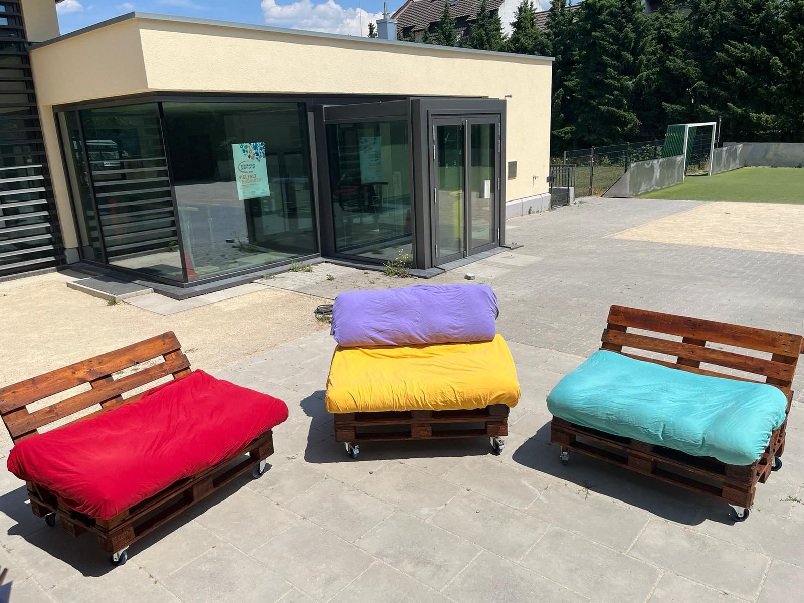 Mit dem Schleifen der Paletten begann unsere Arbeit. Danach wurden die Lehnen gesägt. Der nächste Schritt war das Lasieren der Paletten. Nachdem alles getrocknet war, wurden zum Schluss noch die Rollen montiert.