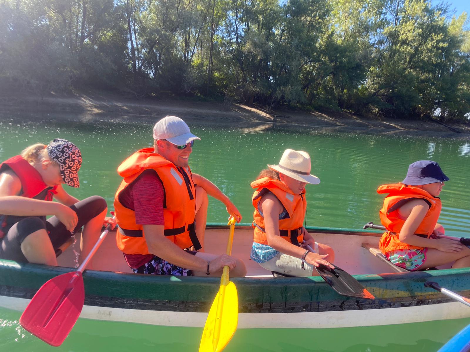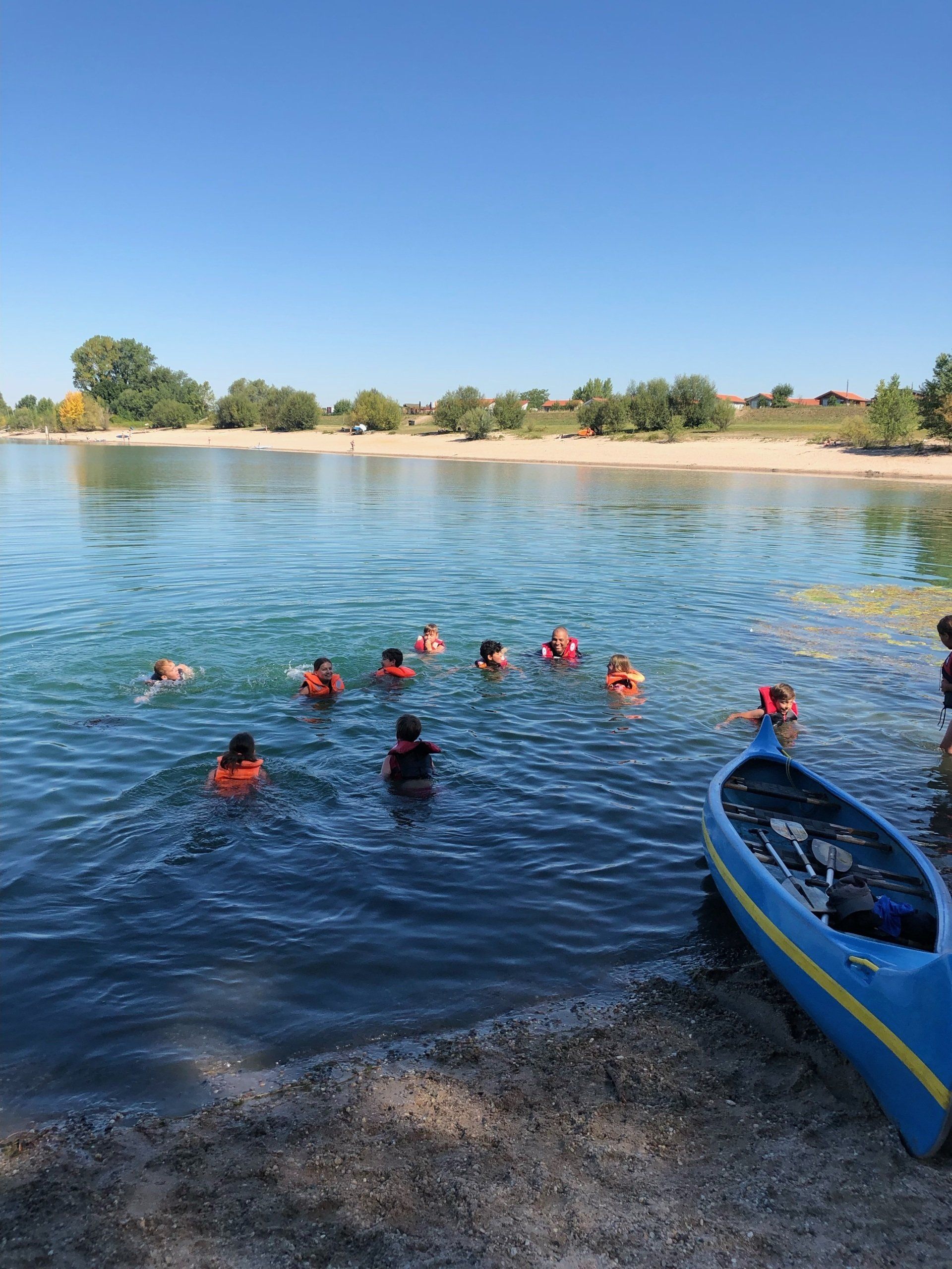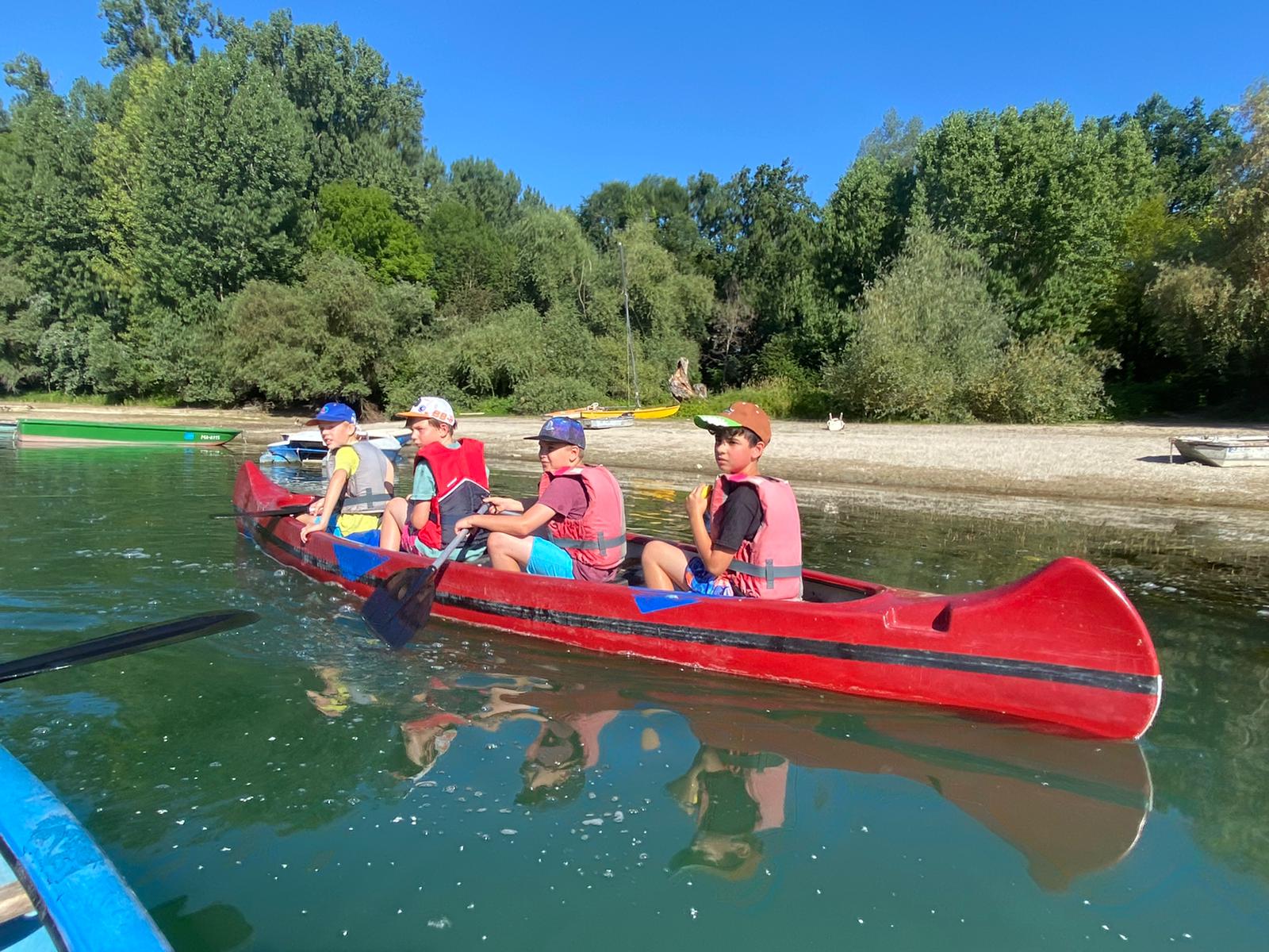 Schnell merkten wir, dass wir als Team zusammenarbeiten müssen um vorwärts zu kommen. Die fünf Kanus machten sich auf den Weg zu einer kleinen Insel. Am Strand durften wir uns im Wasser erfrischen, toben und unser Picknick essen. Danach fuhren wir wieder zurück zum Startpunkt der Kanufahrt.