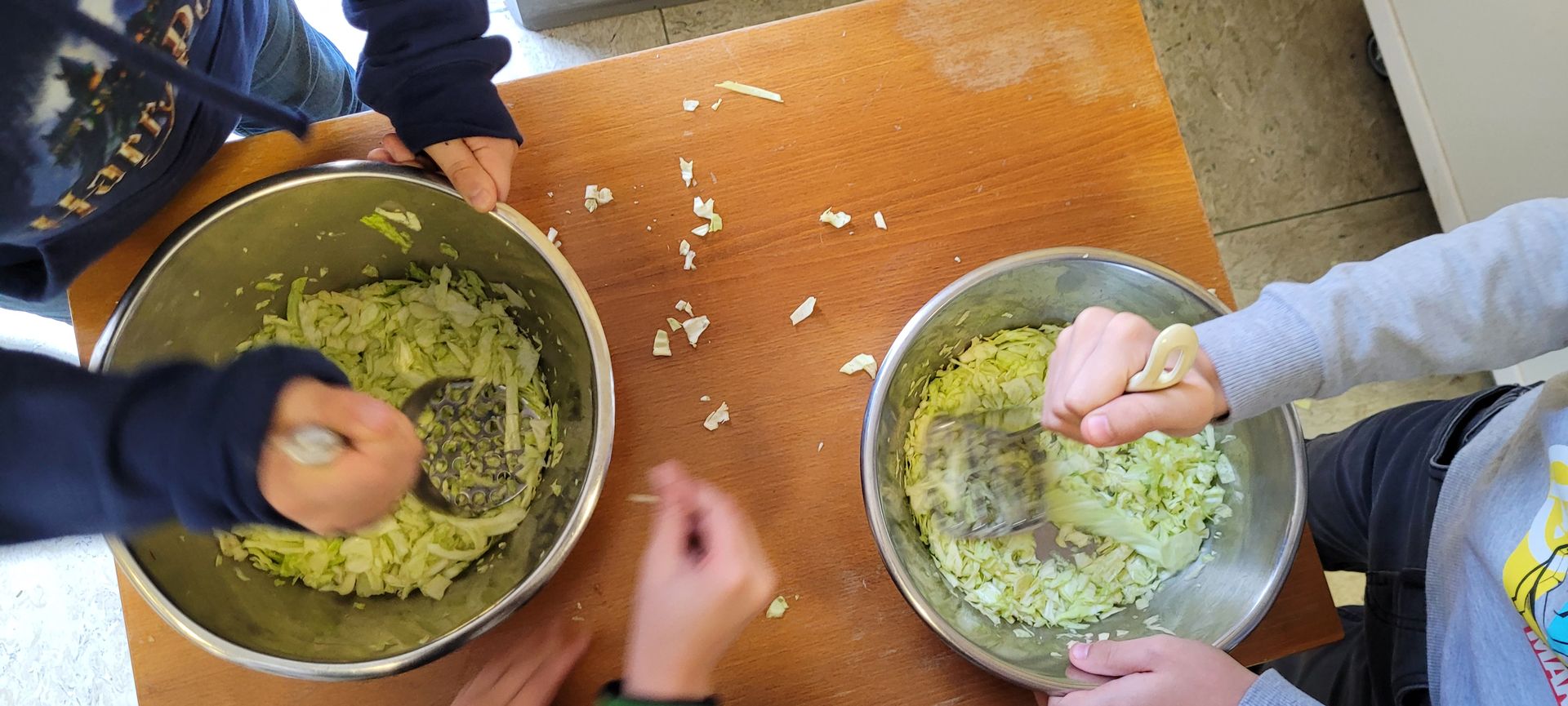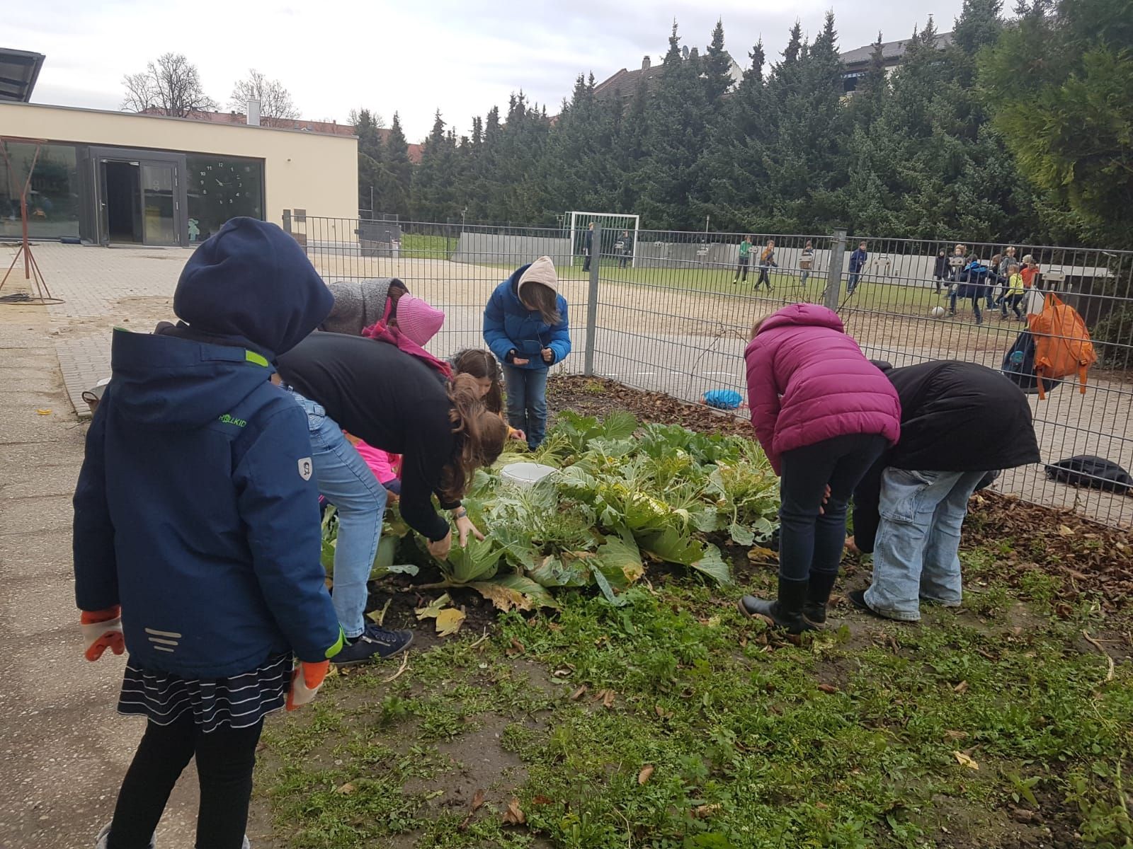 Die kleinen Setzlinge wurden im Schulgarten gehegt und gepflegt, die Weißkohlköpfe von gefräßigen Raupen befreit und vor den Ferien endlich gehobelt und mit Salz und Wasser in einen Sauerkrauttopf gegeben.