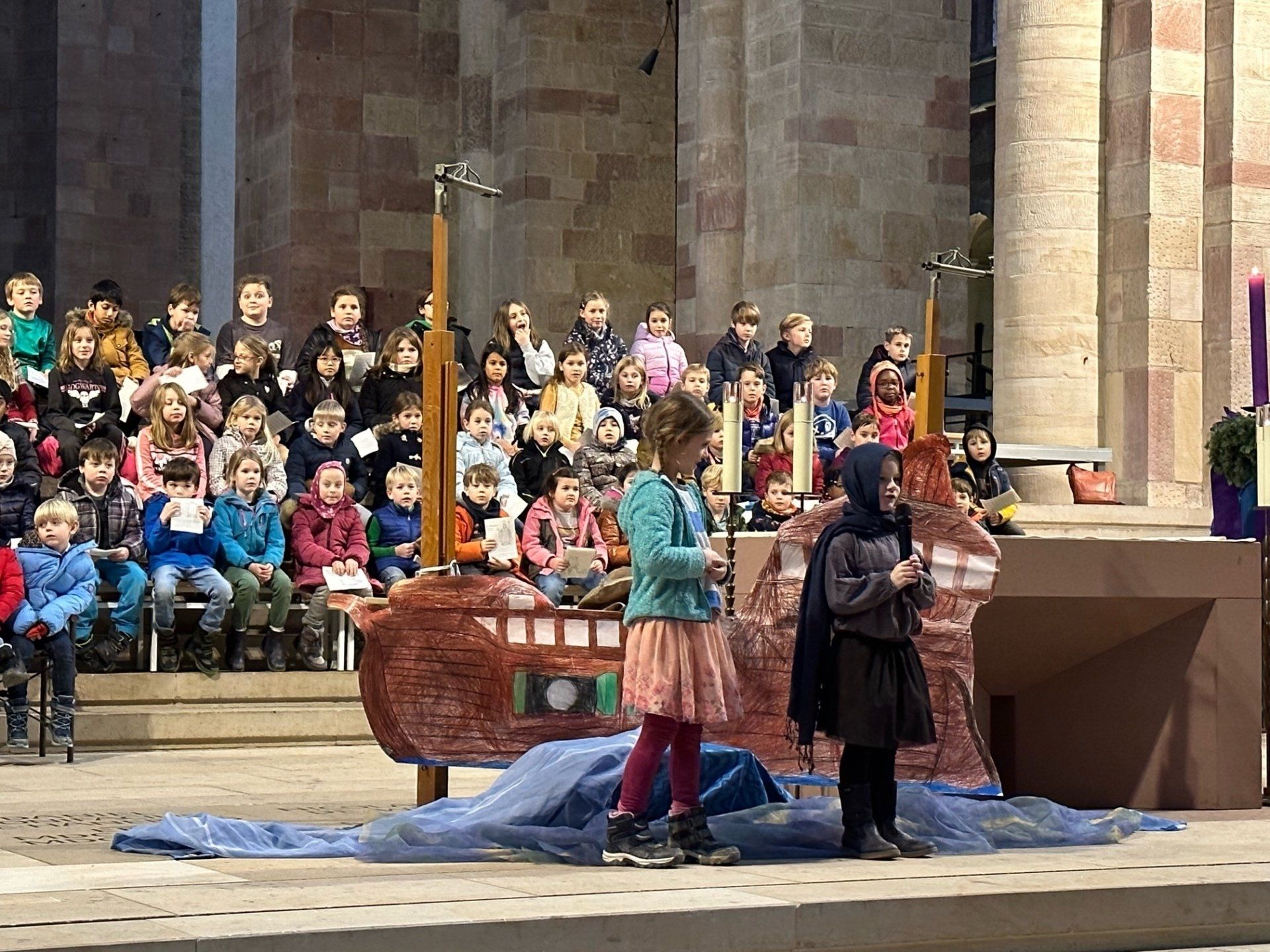 Die Klasse 1a mit Frau Eichenlaub und Schwester Estella hatte für alle Kinder und für die Eltern ein kleines Theaterstück über das Kornwunder vorbereitet und führte es ihm Rahmen des Wortgottesdienstes vor.