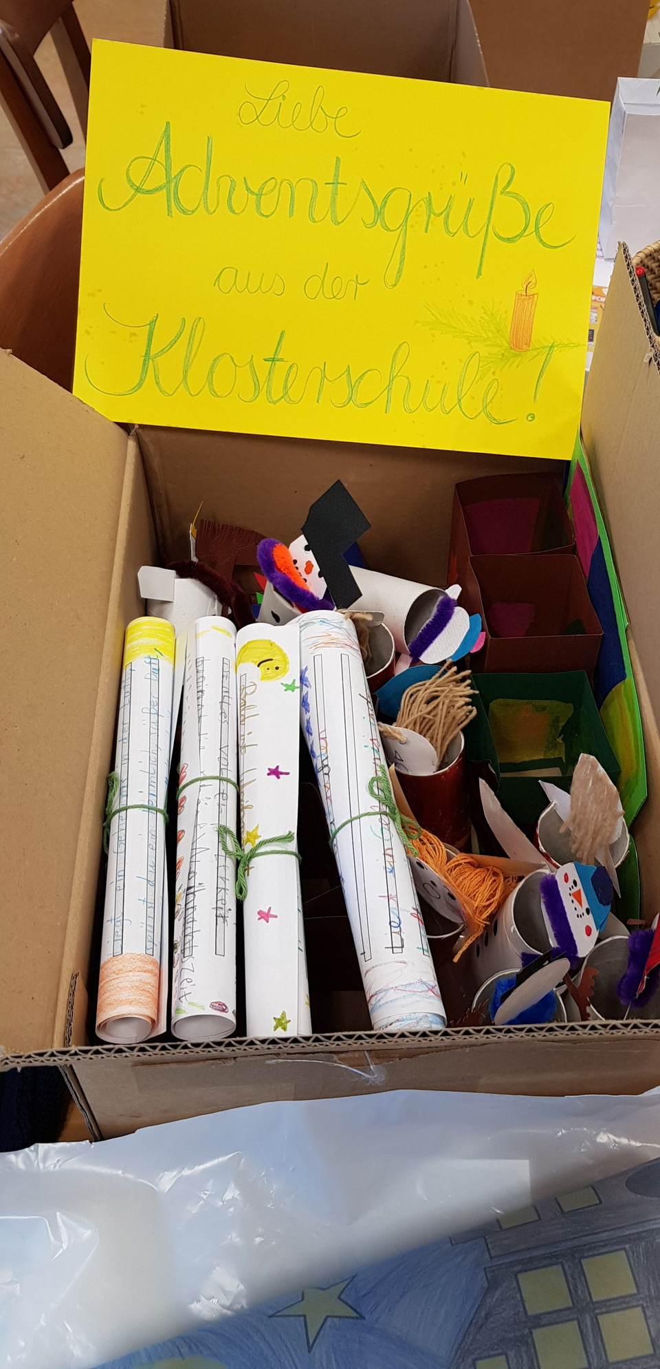 Ein Paket mit vielen verschiedenen Dingen aus allen Klassenstufen wurde von den Klassen 3a und 4a höchstpersönlich vor den Türen des Caritas Altenzentrums St. Martha und des Haus Edelberg abgestellt. Das Paket für das Salier-Stift wurden von den Lehrern überbracht.