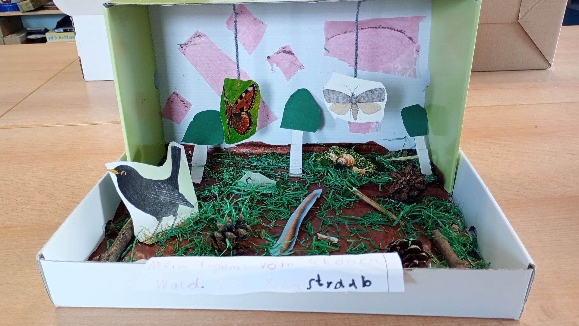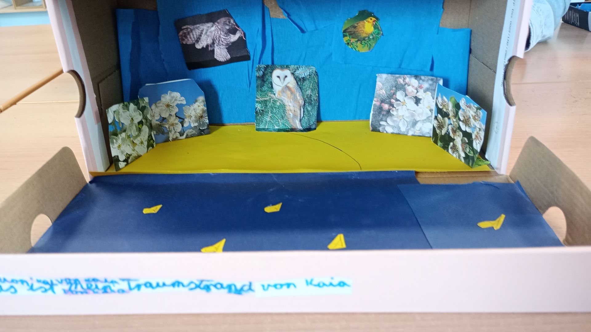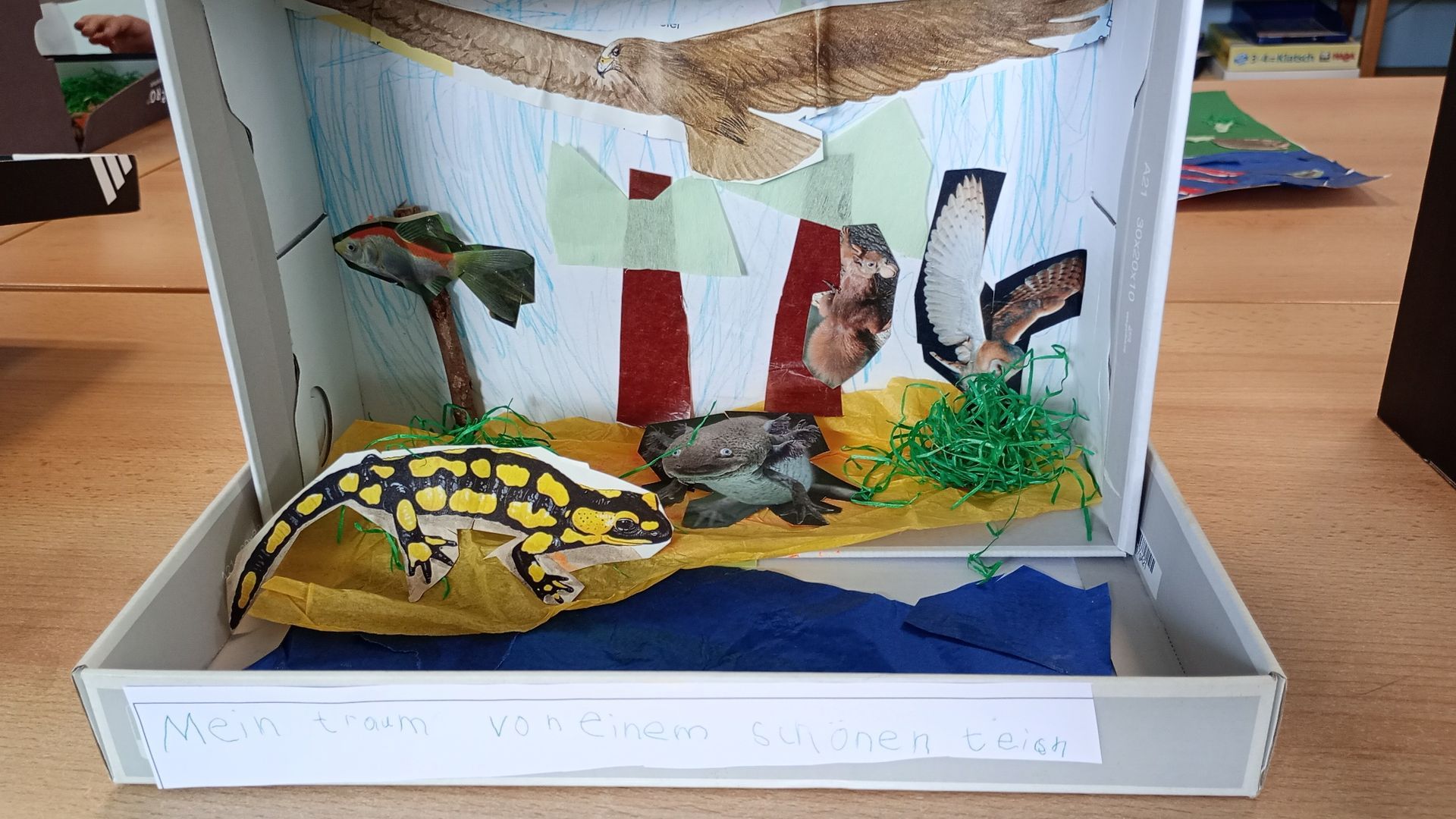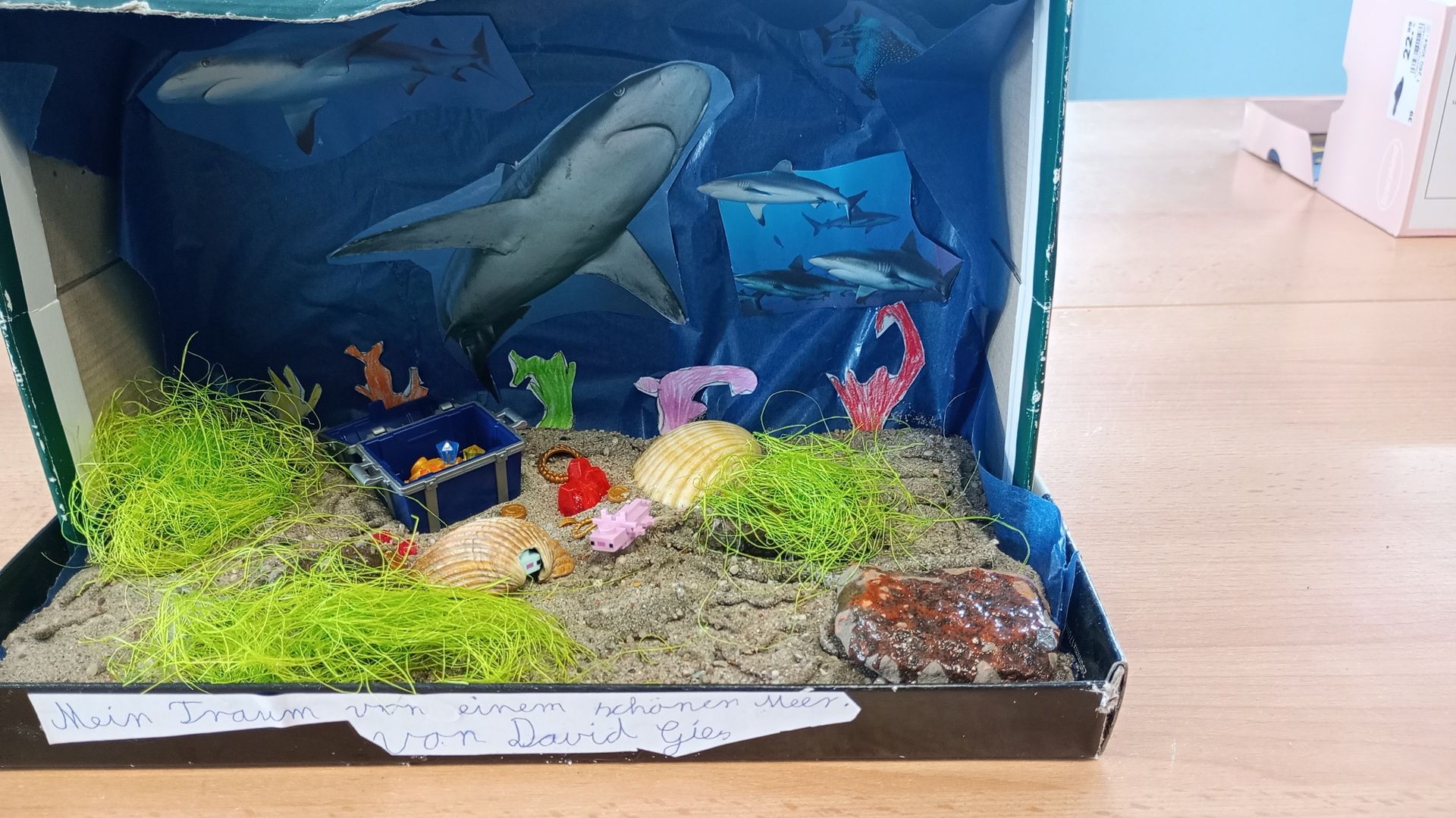 Zu diesem Thema äußerten die Kinder ihre Wünsche: Allen Menschen und Tieren soll es gut gehen, der Klimawandel soll gestoppt werden und vor allem die Umweltverschmutzung soll aufhören. In diesem Sinne gestalteten sie dann auch ihre Wunschlebensräume im Wald, am Teich, im Meer und am Strand.