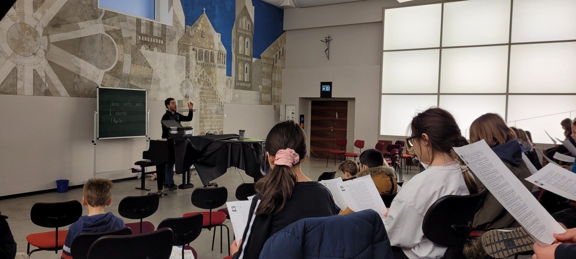 ...trifft sich der Schulchor (zuerst die Klassen 3+4, dann die Klassen 1+2), um gemeinsam Lieder zu erarbeiten, die für den Schulalltag gebraucht werden: Lieder für den Schulgottesdienst am Montagmorgen, für das Singspiel am Schulfest, den Sommertagszug, St. Martin oder St. Nikolaus.