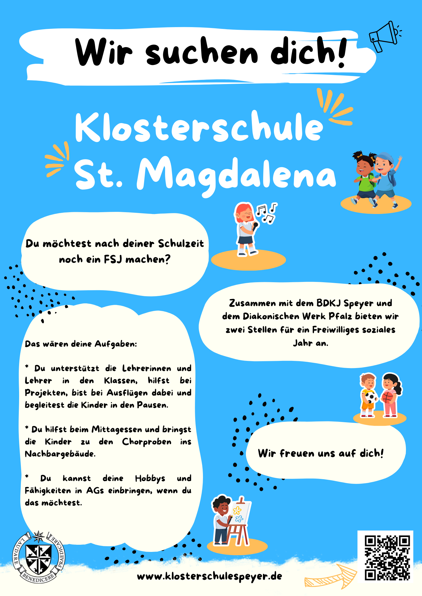 Die Klosterschule St. Magdalena, private staatlich anerkannte zweizügige Ganztagsschule mit chorisch-musikalischem Schwerpunkt in Kooperation mit der Dommusik Speyer, sucht für das kommende Schuljahr